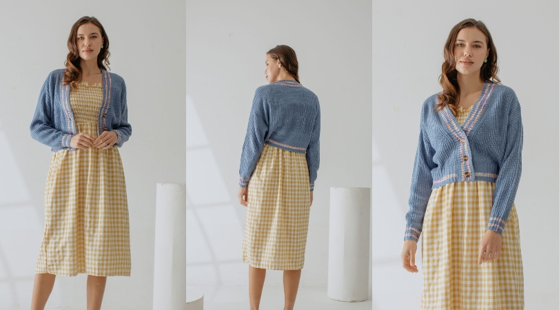 Padukanlah dress tersebut dengan ‘Rebecca Knit Cardigan’ berwarna biru, supaya penampilan lebih fresh dan eye-catching. Cardigan-nya juga punya detail list berwarna kuning, putih, dan ungu, jadi tetap matching sama dress yang kamu pakai, girls!