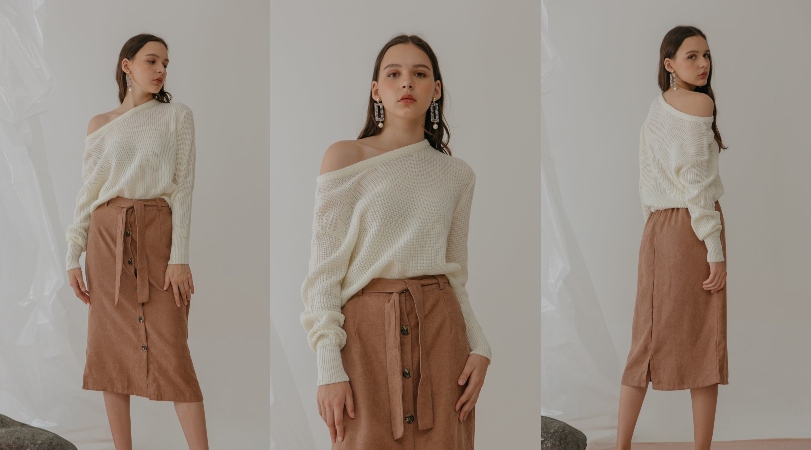 Lalu, rok tersebut dipadukan dengan knit sweater berwarna cream yang nyaman untuk dipakai! Kalau lihat dari perpaduan warnanya, jadi terbayang kopi susu yang hangat, kan?