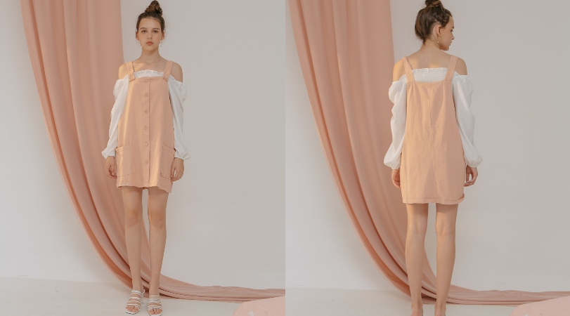 Terdapat off-shoulder blouse putih yang punya detail ruffle dan button dress berwarna pink yang memiliki dua kantong di setiap sisinya. Membuat outfit ini terlihat cute sekaligus fungsional.